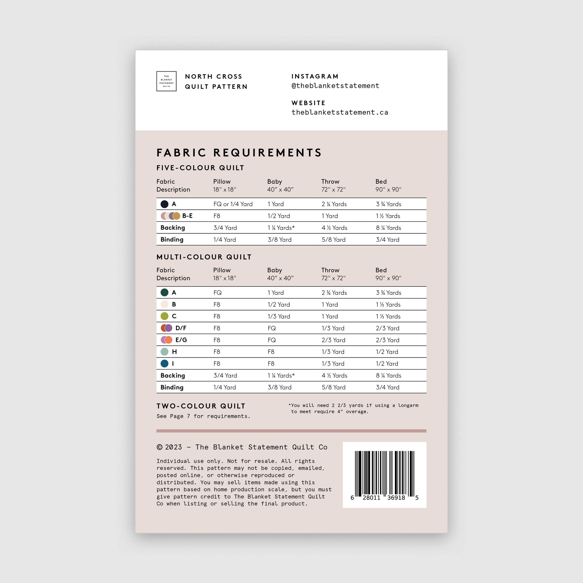 This modern, original quilt pattern is perfect for confident beginners! This pattern offers multiple design variations such as a 2-colour, 5-colour and multi-colour layout. The pattern includes instructions for the following sizes: